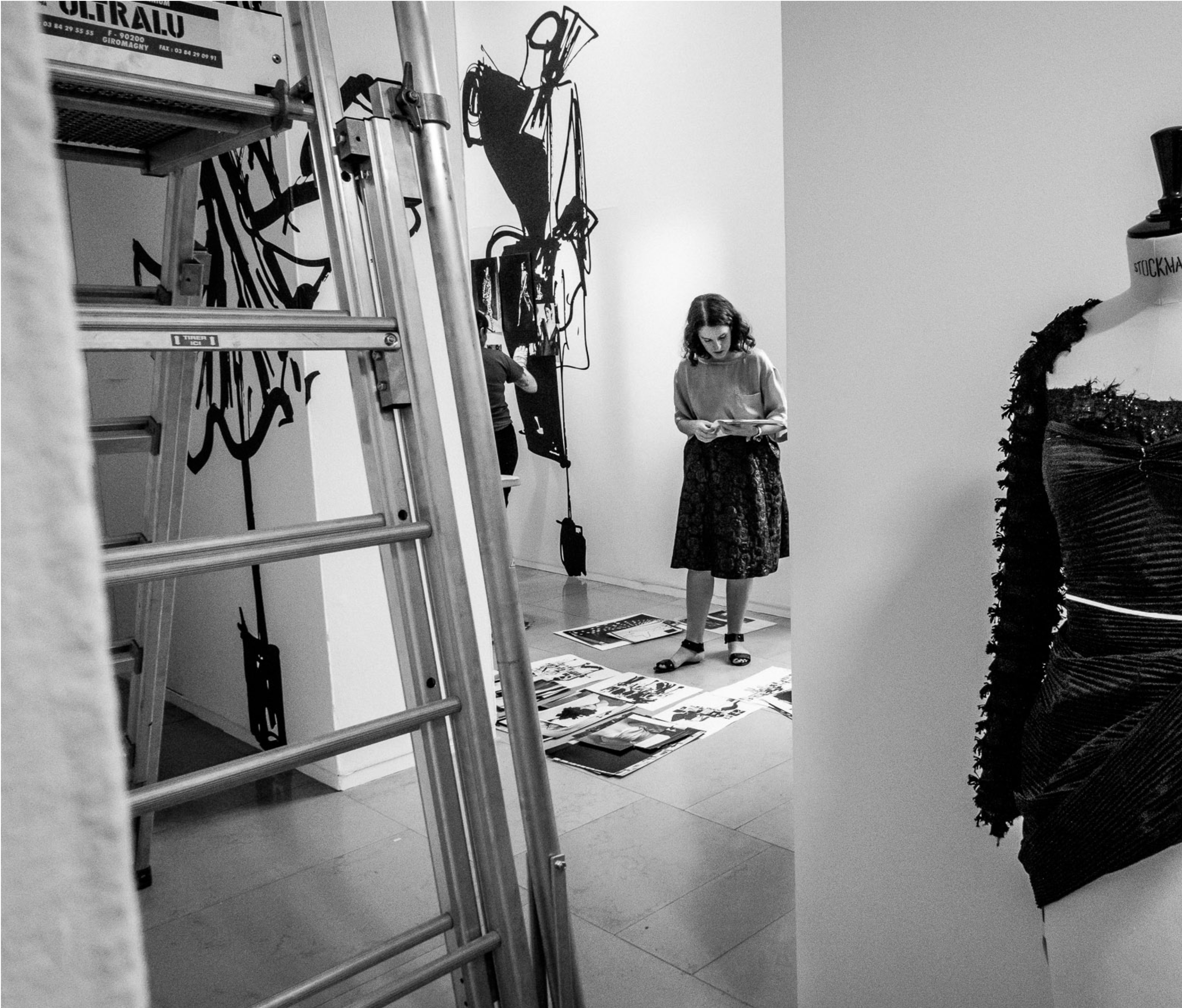 Katy Reiss, Photographed by Jean-Christophe Moine, during the installation of her curated exhibition “Manifest” at The Maison Europeene de la Photographie, Paris.